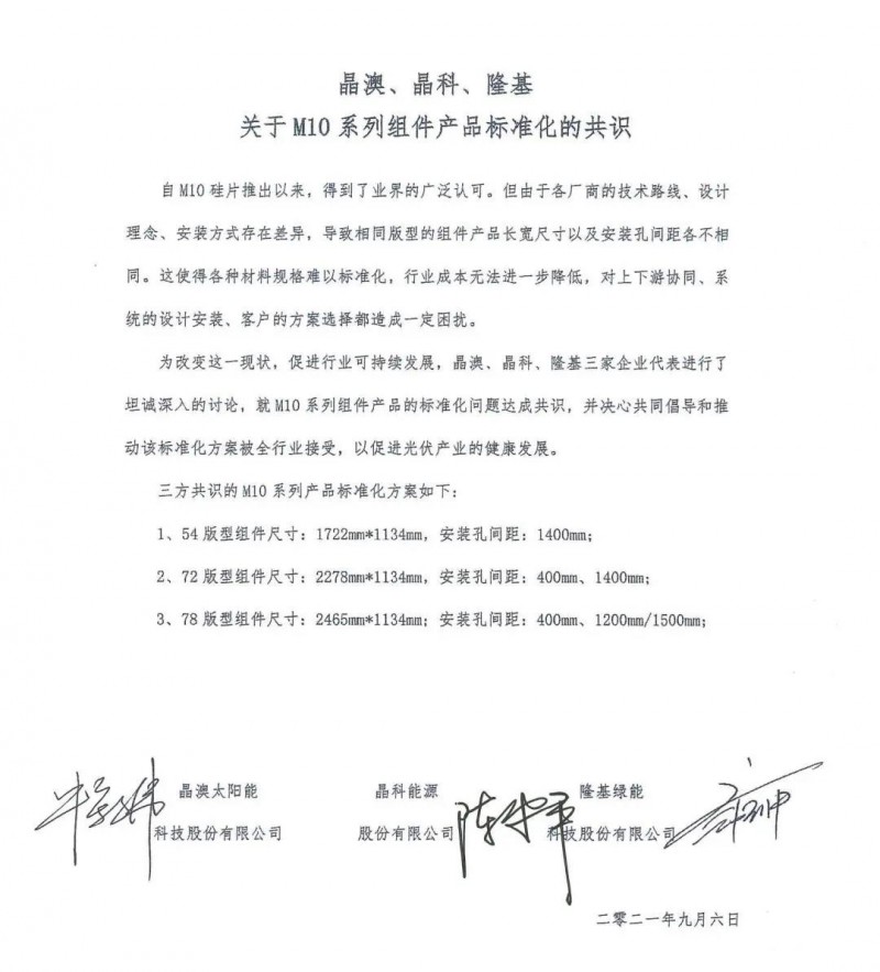 為進(jìn)一步加強(qiáng)上下游產(chǎn)業(yè)協(xié)同,為系統(tǒng)設(shè)計(jì)安裝和客戶方案選擇提供便捷,晶澳、晶科、隆基三家企業(yè)經(jīng)坦誠(chéng)深入溝通,就M10系列組件產(chǎn)品的標(biāo)準(zhǔn)化問題達(dá)成共識(shí),并倡導(dǎo)全行業(yè)采用統(tǒng)一標(biāo)準(zhǔn),促進(jìn)光伏產(chǎn)業(yè)的規(guī)范、健康發(fā)展。