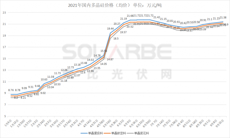 9月15日,硅業(yè)分會(huì)發(fā)布了本周國(guó)內(nèi)多晶硅成交價(jià)。其中單晶復(fù)投料價(jià)格區(qū)間在20.6-21.9萬元/噸,成交均價(jià)小幅上漲至21.38萬元/噸,周環(huán)比漲幅為0.71%;單晶致密料價(jià)格區(qū)間在20.4-21.7萬元/噸,成交均價(jià)上漲至21.15萬元/噸,周環(huán)比漲幅為0.62%。