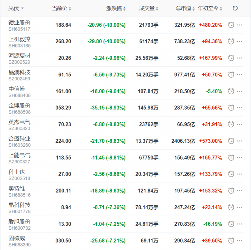 同樣,索比光伏網(wǎng)跟蹤隆基硅片報(bào)價(jià)發(fā)現(xiàn),隆基硅片報(bào)價(jià)分別在3月、4月、6月底保持價(jià)格穩(wěn)定,2021年全年未曾出現(xiàn)降價(jià),M10最新報(bào)價(jià)直接沖上6.14元/片,較年初漲幅超64%。電池端來看,通威本月電池片報(bào)價(jià)還未發(fā)布,但業(yè)內(nèi)人士普遍認(rèn)為,電池片價(jià)格也將上漲。而近期掀起的又一波漲價(jià)潮,也最終反應(yīng)在資本市場(chǎng)。截止中午休盤時(shí)間,德業(yè)股份、上機(jī)數(shù)控主板跌停下跌10%、海源復(fù)材下跌9.96%、晶澳科技下跌9.73%、中信博下跌9.04%。