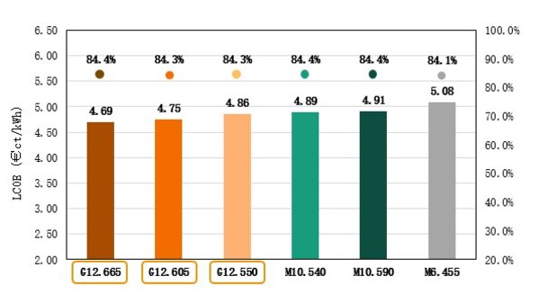 1. G12至尊組件具有最佳的CAPEX和LCOE。對比M10組件,G12組件600W和670W組件的表現(xiàn)尤為優(yōu)異,其CAPEX節(jié)省可達(dá)1.5- 2 歐分/Wp,LCOE節(jié)省可達(dá)3 - 4.5%;對比M6 組件,LCOE節(jié)省可達(dá)6.5%-7.4%。