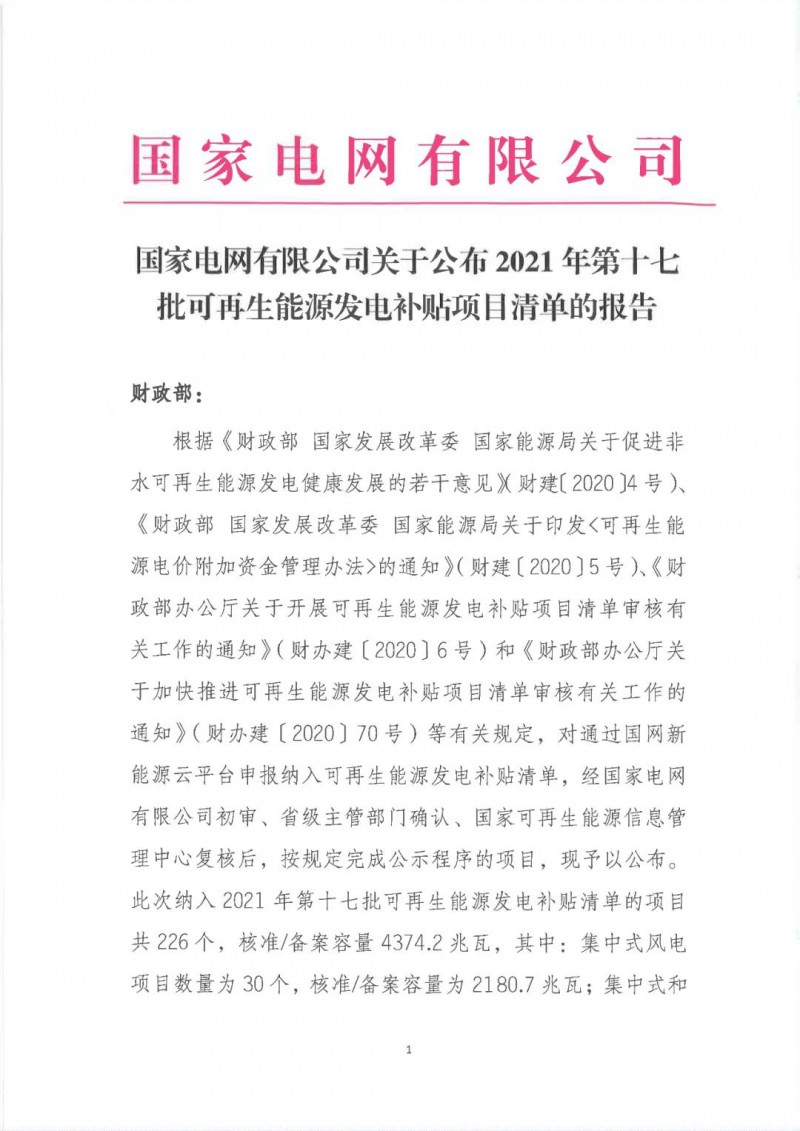 2021年9月15日,我公司已將完成公示的2021年第十七批可再生能源發(fā)電項(xiàng)目補(bǔ)貼項(xiàng)目清單上報(bào)國(guó)家主管部門(mén),第十七批項(xiàng)目清單及后續(xù)項(xiàng)目審核進(jìn)展情況,請(qǐng)登錄新能源云平臺(tái)查詢(xún)。