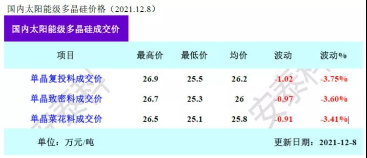 與12月1日相比,多個(gè)等級(jí)多晶硅格開始松動(dòng)下滑,這也是8月11日以來,硅料價(jià)格首次下調(diào)。與本輪漲價(jià)前相比,目前硅料價(jià)格漲幅仍在30%以上。