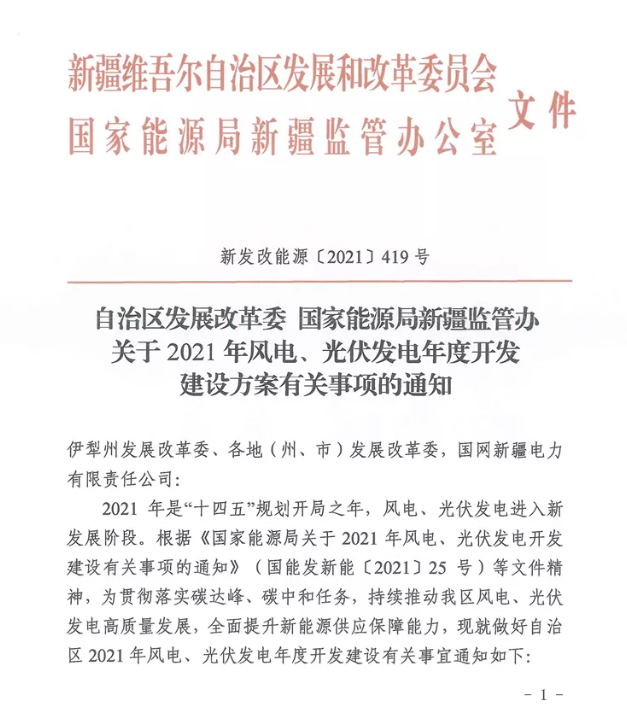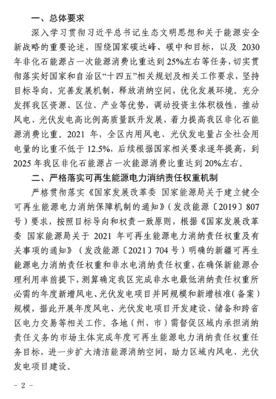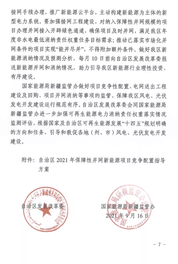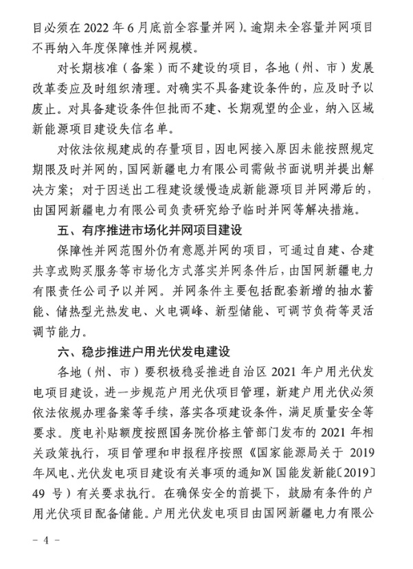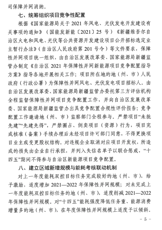通知明確,根據(jù)各地(州、市)新増新能源消納能力,結(jié)合當?shù)匕l(fā)展需求,確定各地(州、市)新增保障性并網(wǎng)規(guī)模。2021年8月前已通過各地(州、市)競爭優(yōu)選、依法依規(guī)確定的風電、光伏發(fā)電項目,全部納入自治區(qū)保障性并網(wǎng)項目范圍,其中光伏項目必須在2021年內(nèi)全容量建成并網(wǎng),風電項目必須在2022年6月底前全容量建成并網(wǎng),以滿足我區(qū)年度非水電最低消納責任權(quán)重任務(wù)目標需求。