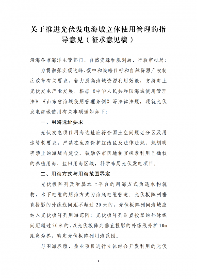 山東省海洋局關于向社會公開征求《關于推進光伏發(fā)電海域使用立體確權的指導意見(征求意見稿)》意見的公告