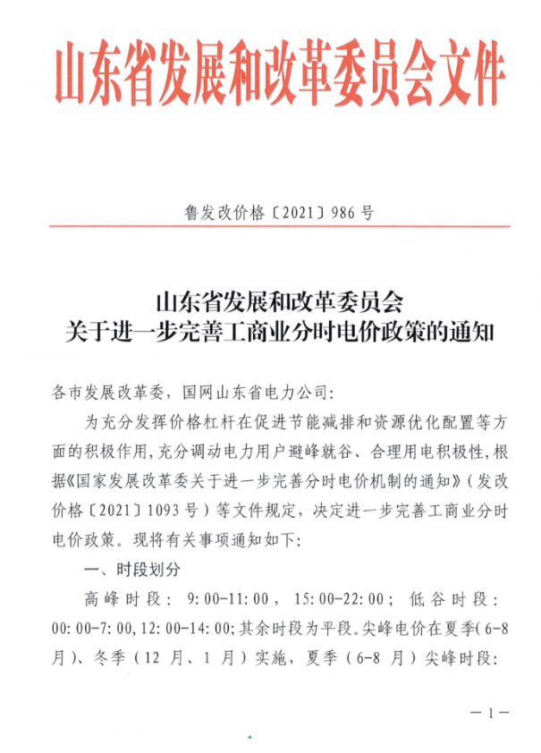 關(guān)于進(jìn)一步完善工商業(yè)分時(shí)電價(jià)政策的通知(魯發(fā)改價(jià)格〔2021〕986號(hào))
