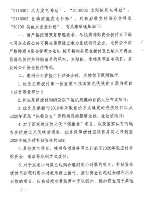 公司嚴(yán)格按照《財(cái)政部關(guān)于下達(dá)2021年可再生能源電價(jià)附加補(bǔ)助資金預(yù)算的通知》(財(cái)資〔2021〕94號)中明確的補(bǔ)貼資金撥付原則和順序,在收到財(cái)政部撥付款項(xiàng)后,對納入補(bǔ)貼目錄或清單且滿足結(jié)算條件的各類項(xiàng)目進(jìn)行及時(shí)、足額轉(zhuǎn)付。具體原則以各省電力公司公告為準(zhǔn)。