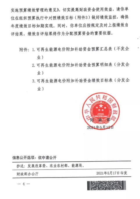 附件:《財(cái)政部關(guān)于下達(dá)2021年可再生能源電價(jià)附加補(bǔ)助資金預(yù)算的通知》(財(cái)資〔2021〕94號)