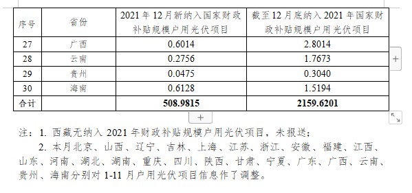 根據(jù)各省級能源主管部門、電網(wǎng)企業(yè)報送信息,經(jīng)國家可再生能源信息管理中心梳理統(tǒng)計,2021年12月新納入國家財政補貼規(guī)模戶用光伏項目總裝機容量為508.98萬千瓦。截至2021年12月底,全國累計納入2021年國家財政補貼規(guī)模戶用光伏項目裝機容量為2159.62萬千瓦。詳細情況見附表。