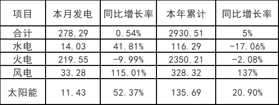 ?。ㄒ唬┌l(fā)電量情況。12月份當(dāng)月,全省發(fā)電量278.29億千瓦時,同比加0.54%。其中水電14.03億千瓦時,同比增長41.81%;火電219.55億千瓦時,同比減少9.99%;風(fēng)電33.28億千瓦時,同比增長115.01%;太陽能11.43億千瓦時,同比增長52.37%。
