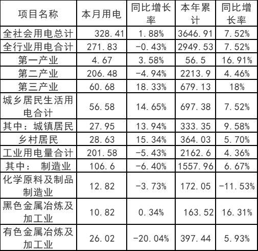 ?。ㄒ唬┤鐣秒娏壳闆r。全省全社會用電量328.41億千瓦時,同比增加1.88%;累計用電量3646.91億千瓦時,同比增加7.52%。