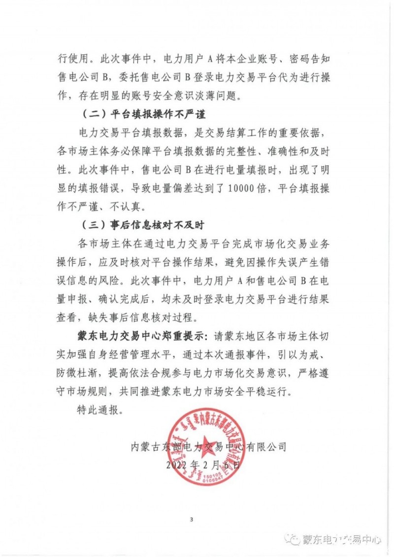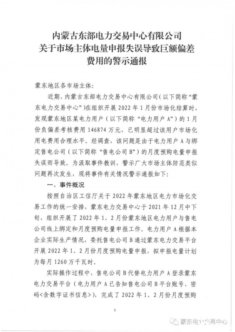 2月6日,內(nèi)蒙古東部電力交易中心有限公司發(fā)布《關(guān)于市場主體電量申報失誤導(dǎo)致巨額偏差費用的警示通報》,
