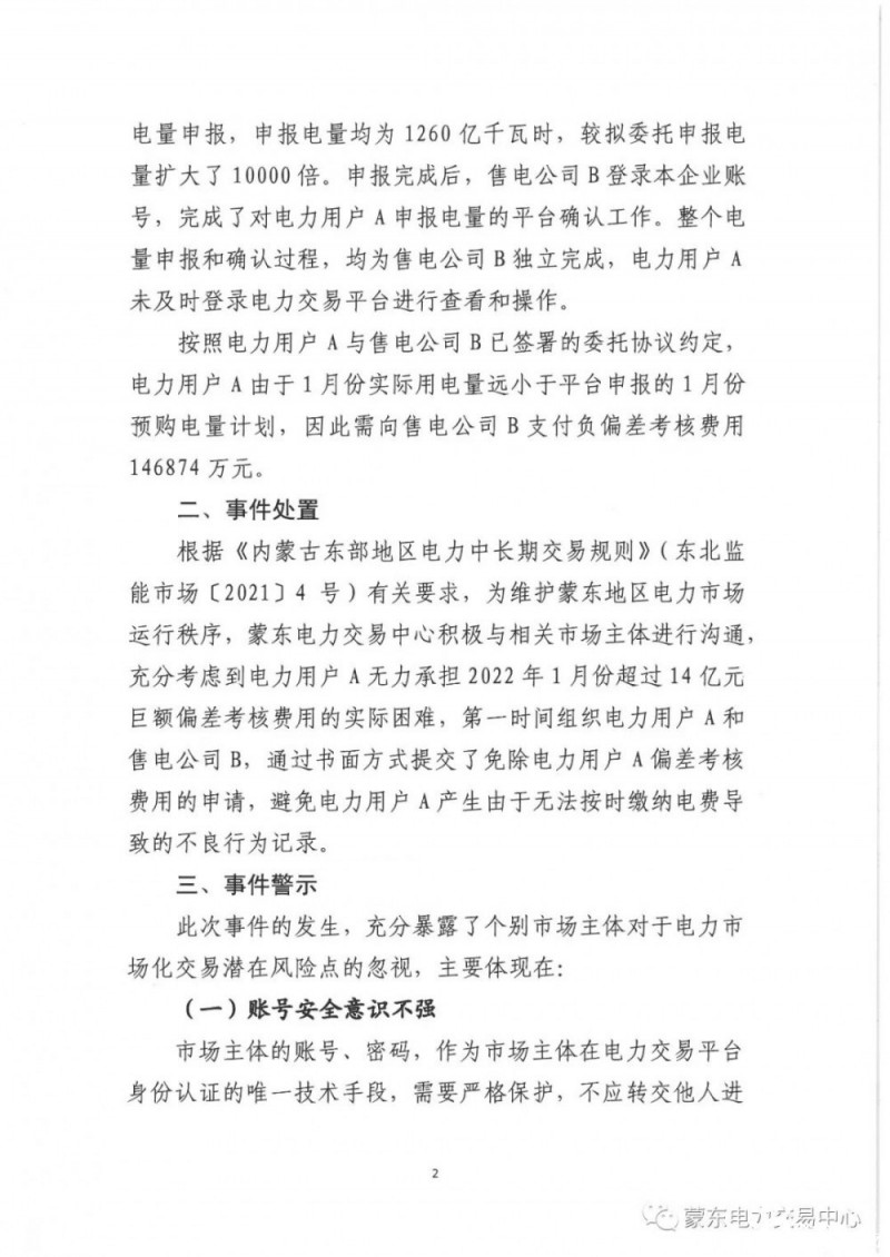 近期,內(nèi)蒙古東部電力交易中心有限公司(以下簡稱“蒙東電力交易中心”)在組織開展2022年1月份市場化結(jié)算時,發(fā)現(xiàn)蒙東地區(qū)某電力用戶(以下簡稱“電力用戶A”)的1月份負偏差考核費用146874萬元,已明顯超過該用戶市場化用電費用合理水平。經(jīng)調(diào)查,該問題是由于電力用戶A與綁定售電公司(以下簡稱“售電公司B”)的月度預(yù)購電量申報失誤而導(dǎo)致。為汲取事件教訓(xùn),警示廣大市場主體防范類似問題再次發(fā)生,現(xiàn)將事件有關(guān)情況警示通報如下: