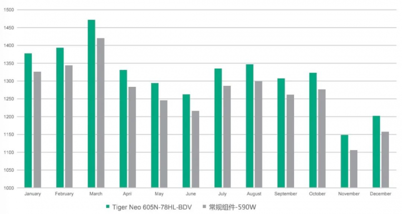逆變器型號(hào)為Sungrow SG225HX型,無(wú)遮蔽,安裝傾斜角度及方位角皆為0º,光照反射率為30%。如圖2所示,Tiger Neo系列組件PR值為88.16%,相較于P型組件85.02%提升了3.14%。11MW項(xiàng)目Tiger Neo雙面組件年發(fā)電量為15791MWh,高于P型雙面組件的年15218MWh的發(fā)電量,全年平均發(fā)電增益約為3.76%(kWh/kWp)。
