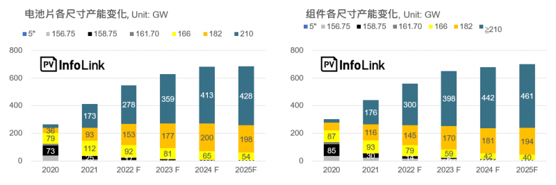2021年年底,大尺寸組件產(chǎn)能超過290GW,210首超過182(來源:PV Infolink)