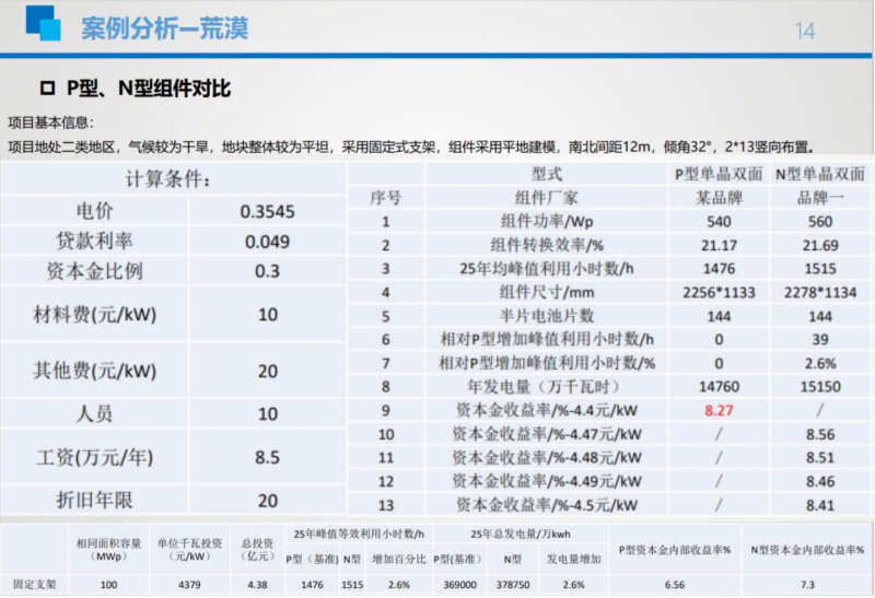 西北勘測設計研究院以西北沙漠、戈壁、荒漠為重點計算對象,預估出不同項目的成本,兼顧環(huán)境、光照等客觀條件變化,從而更直觀對比P型與N型的綜合經(jīng)濟性。就結(jié)果來看,N型組件經(jīng)濟性更勝一籌,而且在復雜用地環(huán)境下,更先進的N型技術(shù)在支架方案、BOS成本等方面更具經(jīng)濟性優(yōu)勢。