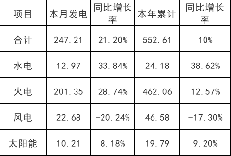 (一)發(fā)電量情況。2月份當(dāng)月,全省發(fā)電量247.21億千瓦時(shí),同比增加21.2%。其中水電12.97億千瓦時(shí),同比增長33.84%;火電201.35億千瓦時(shí),同比增加28.74%;風(fēng)電22.68億千瓦時(shí),同比減少20.24%;太陽能10.21億千瓦時(shí),同比增長8.18%。