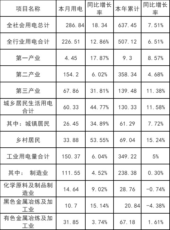 ?。ㄒ唬┤鐣秒娏壳闆r。全省全社會用電量286.84億千瓦時(shí),同比增加18.34%;累計(jì)用電量637.45億千瓦時(shí),同比增加7.51%。