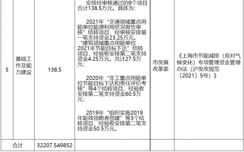 (五)按照《上海市節(jié)能減排(應(yīng)對(duì)氣候變化)專項(xiàng)管理資金管理辦法》(滬發(fā)改規(guī)范〔2021〕5號(hào))等規(guī)定,安排經(jīng)審核通過(guò)的9個(gè)項(xiàng)目合計(jì)138.5萬(wàn)元。具體為: