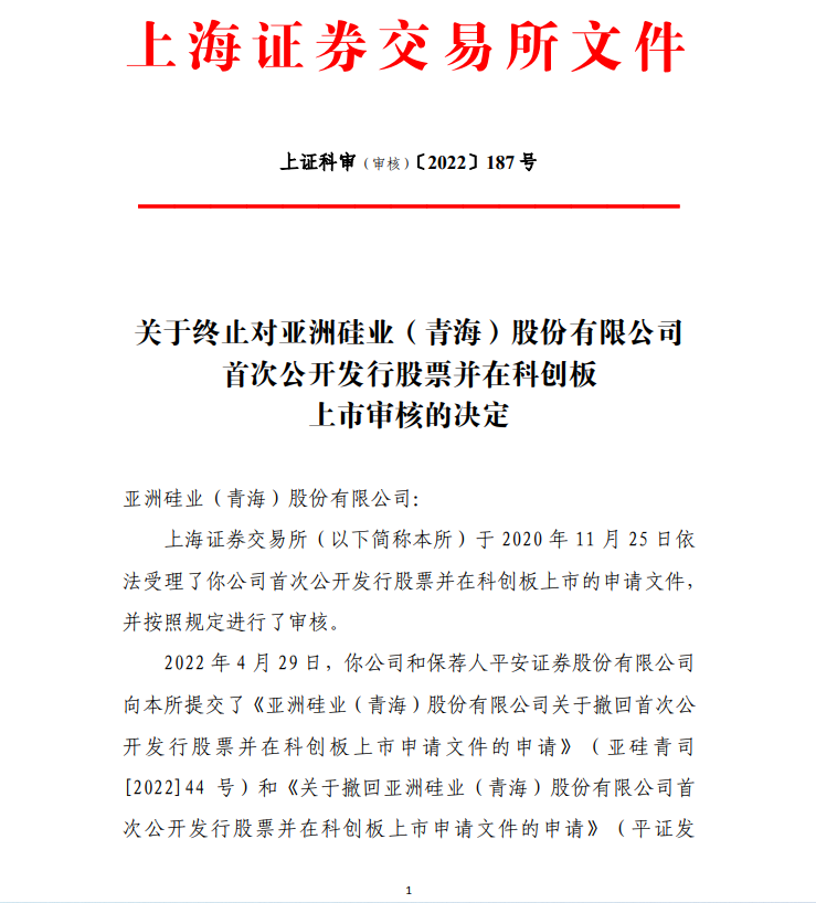 5月1日,上交所披露關(guān)于終止對(duì)亞洲硅業(yè)(青海)股份有限公司首次公開(kāi)發(fā)行股票并在科創(chuàng)板上市審核的決定:4月29日,亞洲硅業(yè)(青海)股份有限公司因發(fā)行人撤回發(fā)行上市申請(qǐng)或者保薦人撤銷保薦。根據(jù)規(guī)定,上交所終止其發(fā)行上市審核。