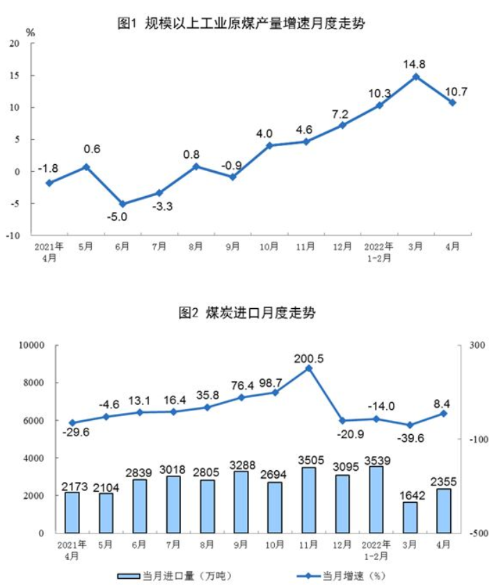 原煤生產(chǎn)較快增長,進口由降轉(zhuǎn)增。煤炭增產(chǎn)增供政策持續(xù)推進,原煤生產(chǎn)保持較快增長。4月份,生產(chǎn)原煤3.6億噸,同比增長10.7%,增速比上月放緩4.1個百分點,日均產(chǎn)量1209萬噸。進口煤炭2355萬噸,同比增長8.4%,上月為下降39.6%。