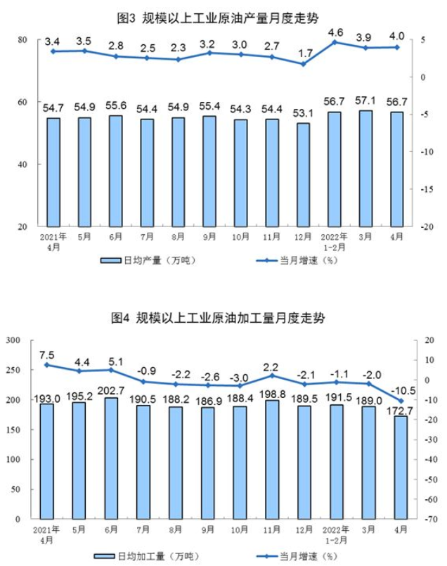 原油生產(chǎn)穩(wěn)定增長,進口由降轉(zhuǎn)增。4月份,生產(chǎn)原油1700萬噸,同比增長4.0%,增速比上月加快0.1個百分點,日均產(chǎn)量56.7萬噸。進口原油4303萬噸,同比增長6.6%,上月為下降14.0%。