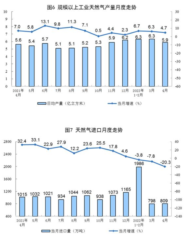 天然氣生產(chǎn)保持平穩(wěn),進口降幅擴大。4月份,生產(chǎn)天然氣177億立方米,同比增長4.7%,增速比上月放緩1.6個百分點,日均產(chǎn)量5.9億立方米。進口天然氣809萬噸,同比下降20.3%,降幅比上月擴大12.5個百分點。