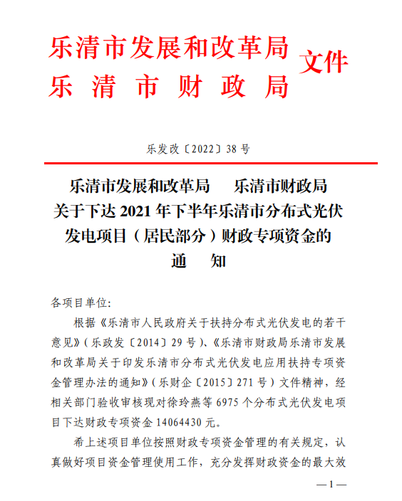根據(jù)《樂(lè)清市人民政府關(guān)于扶持分布式光伏發(fā)電的若干意見(jiàn)》(樂(lè)政發(fā)〔2014〕29號(hào))、《樂(lè)清市財(cái)政局樂(lè)清市發(fā)展和改革局關(guān)于印發(fā)樂(lè)清市分布式光伏發(fā)電應(yīng)用扶持專(zhuān)項(xiàng)資金管理辦法的通知》(樂(lè)財(cái)企〔2015〕271號(hào))文件精神,經(jīng)相關(guān)部門(mén)驗(yàn)收審核現(xiàn)對(duì)徐玲燕等6975個(gè)分布式光伏發(fā)電項(xiàng)目下達(dá)財(cái)政專(zhuān)項(xiàng)資金14064430元。