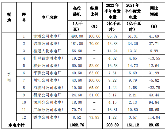 截至2022年6月30日,廣西桂冠電力股份有限公司直屬及控股公司電廠累計完成發(fā)電量230.02億千瓦時,同比增加24.94%。其中:水電208.89億千瓦時,同比增加29.65%;火電11.00億千瓦時,同比減少39.92%;風(fēng)電9.78億千瓦時,同比增加108.97%;光伏0.35億千瓦時?,F(xiàn)將公司直屬及控股公司各電廠2022年上半年發(fā)電量完成情況公告如下: