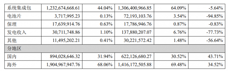 從營收構(gòu)成來看,組件產(chǎn)品占總營收的53.69%,系統(tǒng)集成包占總營收的44.04%。從地區(qū)業(yè)務(wù)分布來看,海外市場占總營收的68.06%。