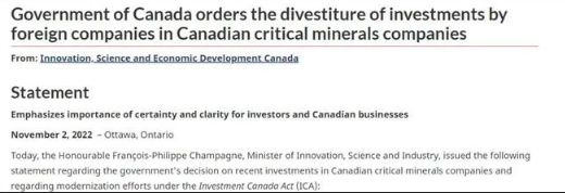 《加拿大投資法》要求外國投資接受審查,以考慮國家安全問題,弗朗索瓦表示,關鍵的礦產(chǎn)投資得加強審查。他說,國家安全和情報機構的“多步驟國家安全審查程序”得出結論,3家中國公司必須剝離其在加拿大關鍵礦產(chǎn)公司的股份。
