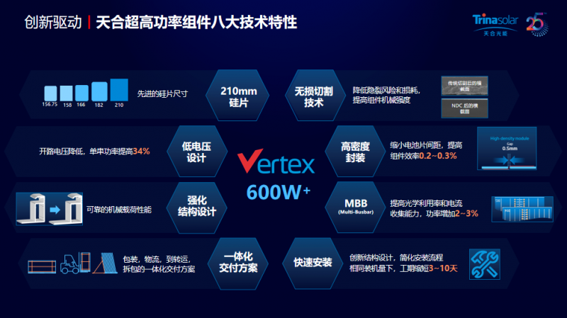 天合超高功率組件采用了先進(jìn)的210硅片尺寸,以及無損切割技術(shù)、高密度封裝、MBB、低電壓設(shè)計(jì)、強(qiáng)化結(jié)構(gòu)設(shè)計(jì)、快速安裝、一體化交付等先進(jìn)技術(shù),還打造了嚴(yán)苛的質(zhì)量管控體系,通過冰雹撞擊、鉛彈撞擊、風(fēng)壓雪壓等極限測(cè)試,確保設(shè)備穩(wěn)定運(yùn)行25年以上。真正實(shí)現(xiàn)“四高一低”,即高功率、高效率、高可靠性、高發(fā)電量和更低度電成本,并且能夠滿足全場(chǎng)景使用。