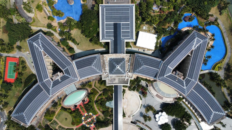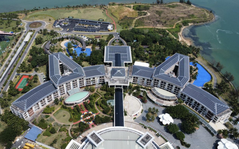 于是,在島內(nèi)亞論酒店、新聞中心、停車(chē)場(chǎng)等可利用的屋頂、空地上,一塊塊光伏組件產(chǎn)品成為這些地標(biāo)建筑的“新外衣”,源源不斷地為博鰲亞洲論壇提供重要的綠電供應(yīng)和保障。