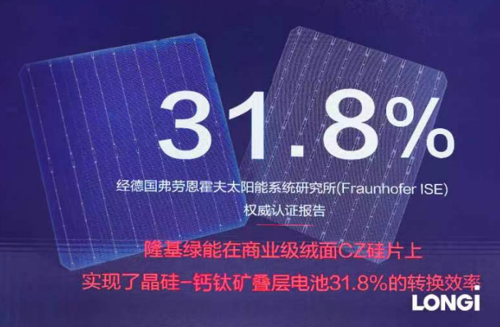 隆基始終專注太陽能電池轉換效率的提升。近日,隆基在商業(yè)級絨面CZ硅片上實現了晶硅-鈣鈦礦疊層電池31.8%的轉換效率,該技術將成為隆基布局未來創(chuàng)新技術、突破產業(yè)化的又一重大方向。