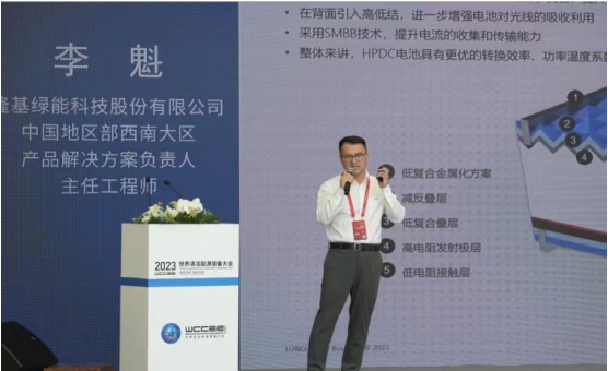 隆基綠能中國地區(qū)部西南大區(qū)產(chǎn)品解決方案負責人、主任工程師李魁介紹Hi-MO 7新品價值