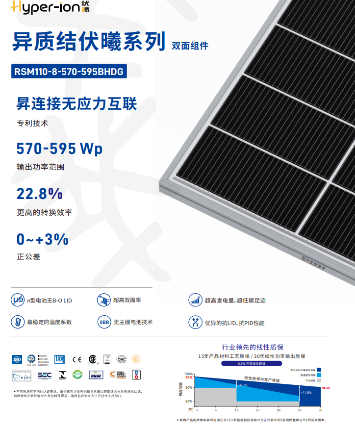 異質(zhì)結(jié)伏曦組件作為公司“雙輪驅(qū)動(dòng)”產(chǎn)品開發(fā)戰(zhàn)略下打造的王牌產(chǎn)品,基于210技術(shù)平臺(tái)疊加n型異質(zhì)結(jié)技術(shù),采用了薄片化、雙面微晶技術(shù)、低銀含漿料、無主柵電池、昇連接無應(yīng)力互聯(lián)技術(shù)等多項(xiàng)關(guān)鍵核心技術(shù),不僅效率可達(dá)23.9%,還具備極穩(wěn)定的溫度系數(shù)以及85%±10%超高雙面率,碳足跡數(shù)值更是遠(yuǎn)超行業(yè)平均水平,可低于400kg(kgeqCO2/kWc)。組件可賦能光伏電站更有效將豐富的光照資源轉(zhuǎn)化為綠色電能,進(jìn)而充分滿足客戶工業(yè)和居民用電需求,以更低的度電成本助力低碳用能轉(zhuǎn)型。