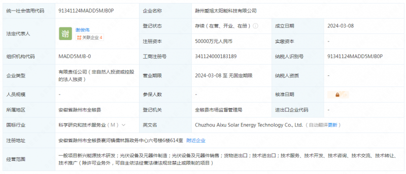 企查查顯示,近日,滁州愛旭太陽能科技有限公司成立,法定代表人為謝俊偉,注冊資本5億元,經營范圍包含:新興能源技術研發(fā);光伏設備及元器件制造;光伏設備及元器件銷售等。