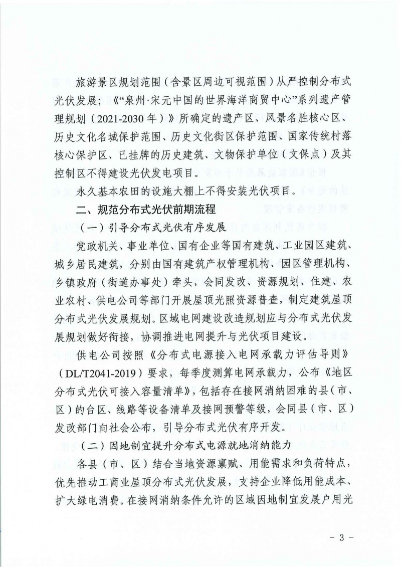 4月2日,泉州市鯉城區(qū)發(fā)展和改革局關(guān)于轉(zhuǎn)發(fā)《泉州市發(fā)展和改革委員會(huì)等7部門關(guān)于推動(dòng)泉州市分布式光伏發(fā)電項(xiàng)目高質(zhì)量發(fā)展的通知》的通知,通知指出,旅游景區(qū)規(guī)劃范圍(含景區(qū)周邊可視范圍)從嚴(yán)控制分布式光伏發(fā)展;《“泉州·宋元中國(guó)的世界海洋商貿(mào)中心”系列遺產(chǎn)管理規(guī)劃(2021-2030年)》所確定的遺產(chǎn)區(qū)、風(fēng)景名勝核心區(qū)、歷史文化名城保護(hù)范圍、歷史文化街區(qū)保護(hù)范圍、國(guó)家傳統(tǒng)村落核心保護(hù)區(qū)、已掛牌的歷史建筑、文物保護(hù)單位(文保點(diǎn))及其控制區(qū)不得建設(shè)光伏發(fā)電項(xiàng)目。永久基本農(nóng)田的設(shè)施大棚上不得安裝光伏項(xiàng)目。