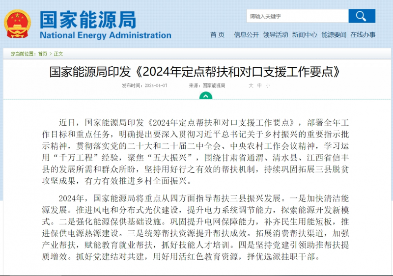 2024年4月7日,國家能源局印發(fā)《2024年定點(diǎn)幫扶和對(duì)口支援工作要點(diǎn)》,部署全年工作目標(biāo)和重點(diǎn)任務(wù)。