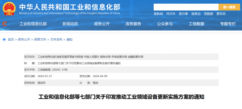 工業(yè)和信息化部等七部門關(guān)于印發(fā)推動(dòng)工業(yè)領(lǐng)域設(shè)備更新實(shí)施方案的通知