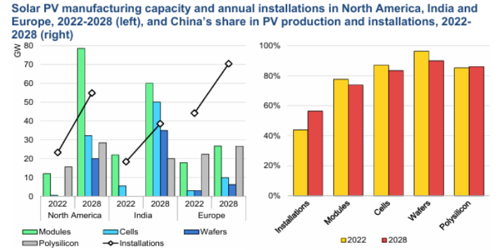 圖2 2022~2028年北美、印度和歐洲的光伏產(chǎn)能和年度裝機(jī)容量(左圖),以及2022~2028年中國光伏產(chǎn)能和年度裝機(jī)容量(右圖)