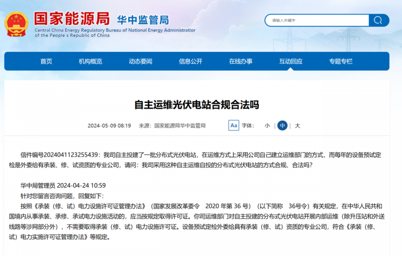 對此,國家能源局華中監(jiān)管局回復(fù):按照《承裝(修、試)電力設(shè)施許可證管理辦法》(國家發(fā)展改革委令 2020年第36號)(以下簡稱 36號令)有關(guān)規(guī)定,在中華人民共和國境內(nèi)從事承裝、承修、承試電力設(shè)施活動的,應(yīng)當(dāng)按規(guī)定取得許可證。你司運維部門對自主投建的分布式光伏電站開展內(nèi)部運維(除升壓站和外送線路等涉網(wǎng)部分外),不需要取得承裝(修、試)電力設(shè)施許可證。設(shè)備預(yù)試定檢外委給具有承裝(修、試)資質(zhì)的專業(yè)公司,符合《承裝(修、試)電力實施許可證管理辦法》等規(guī)定。