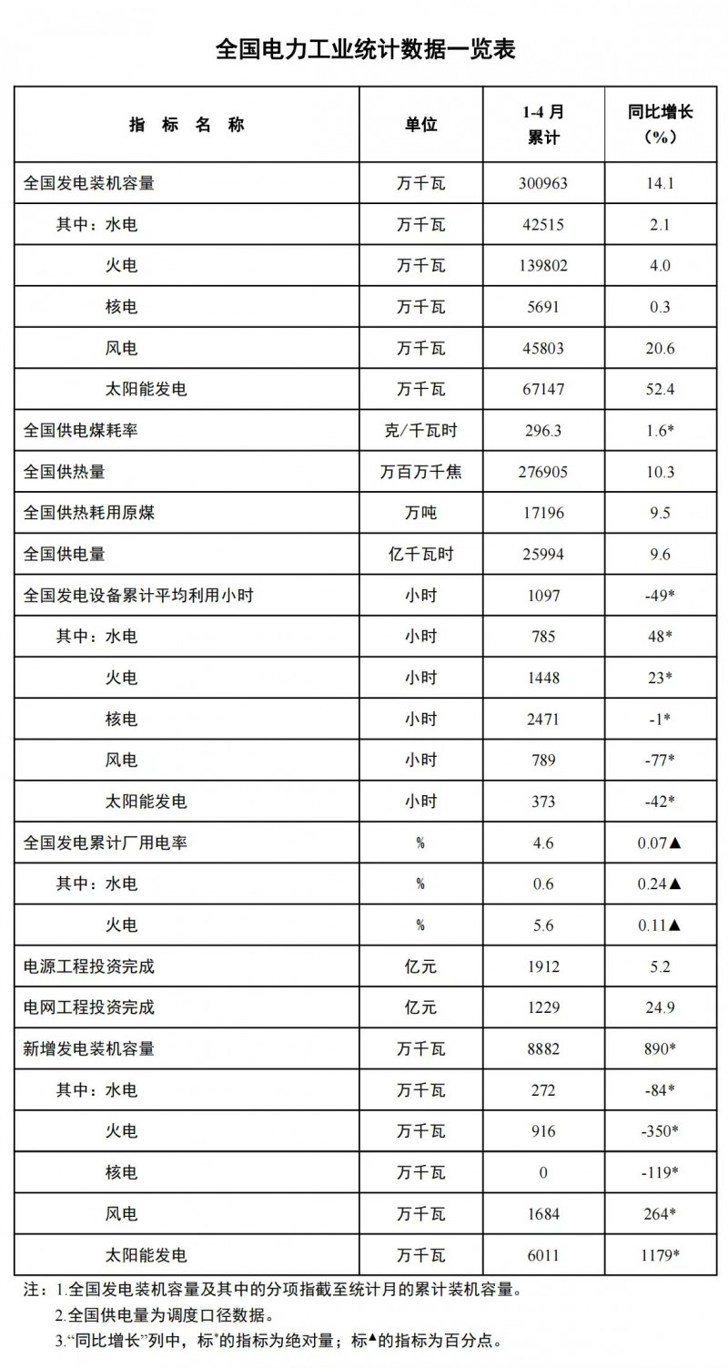 5月23日,國(guó)家能源局發(fā)布1-4月份全國(guó)電力工業(yè)統(tǒng)計(jì)數(shù)據(jù)。截至4月底,全國(guó)累計(jì)發(fā)電裝機(jī)容量約30.1億千瓦,同比增長(zhǎng)14.1%。其中,太陽(yáng)能發(fā)電裝機(jī)容量約6.7億千瓦,同比增長(zhǎng)52.4%;風(fēng)電裝機(jī)容量約4.6億千瓦,同比增長(zhǎng)20.6%。