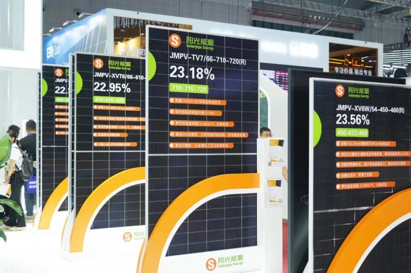 陽光能源作為一家專業(yè)化光伏組件制造商,已連續(xù)多年參與上海展會。本屆展會,陽光能源在5.2號館B150號展臺上進行了Giga-N系列高效組件的全景展示,展出的6款N型TOPCon組件能夠滿足大型地面電站、工商業(yè)屋頂、分布式屋頂?shù)榷嘣瘧?yīng)用場景需求,兼具高功率、高效率和高發(fā)電量等多重優(yōu)勢,其中一款TOPCon疊加0BB技術(shù)的組件獲得了眾多觀眾的駐足了解。此外,同步展出的還有一款新品N型HJT組件,也是本次展品中轉(zhuǎn)換效率最高的一款產(chǎn)品,效率可達23.18%,最大功率可以達到720W。