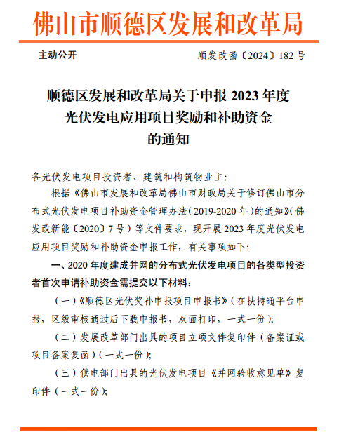 8月22日,順德區(qū)發(fā)展和改革局發(fā)布關(guān)于組織申報(bào)2023年度光伏發(fā)電應(yīng)用項(xiàng)目獎勵和補(bǔ)助資金的通知。