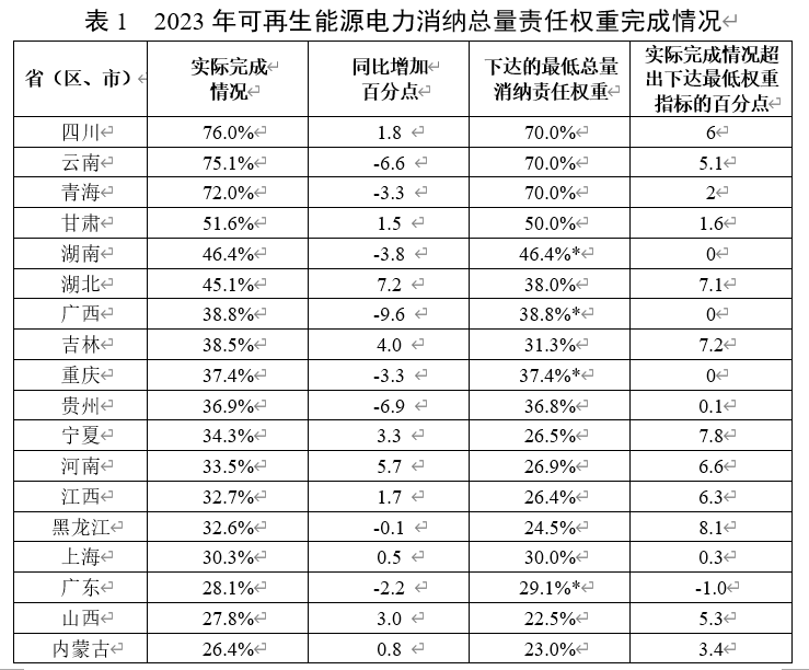 根據(jù)《國家發(fā)展改革委辦公廳國家能源局綜合司關(guān)于2023年可再生能源電力消納責任權(quán)重及有關(guān)事項的通知》(發(fā)改辦能源〔2023〕569號),綜合考慮各省本地生產(chǎn)、本地利用以及外來電力消納情況,全國各?。ㄗ灾螀^(qū)、直轄市)可再生能源電力消納責任權(quán)重總體完成較好,具體完成情況如下。