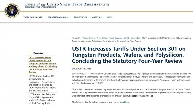 最新消息,美國貿(mào)易代表辦公室當(dāng)?shù)貢r間12月11日發(fā)布聲明稱,經(jīng)過為期四年的審查,美國將根據(jù)“301條款”提高對自中國進口的太陽能晶片、多晶硅和部分鎢產(chǎn)品的進口關(guān)稅。晶片和多晶硅的關(guān)稅稅率將提高到50%,部分鎢產(chǎn)品的關(guān)稅稅率將提高到25%。關(guān)稅上調(diào)措施將于明年1月1日生效。