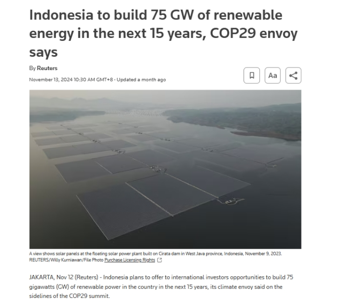 “我們需要努力實現(xiàn)目標(biāo)(EBT組合)。到2025年,我們的目標(biāo)是23%的EBT組合,”印尼能源和礦產(chǎn)資源部部長ArifinTasrif表示。為實現(xiàn)這一目標(biāo),當(dāng)?shù)卣扇×硕嘀嘏e措,吸引外國投資,加快能源轉(zhuǎn)型。COP29 峰會期間,印尼氣候特使就曾表示,計劃向國際投資者提供未來15年在該國建設(shè)75GW可再生能源機會。“該計劃是印尼新總統(tǒng)普拉博沃·蘇比安托的承諾。