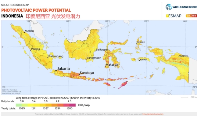 印度尼西亞位于赤道地區(qū),年日照時長達3500小時,擁有豐富的太陽能資源,據(jù)IESR估計,根據(jù)土地可用性情景,印尼太陽能的技術(shù)潛力在3397GWp至19835GWp之間。