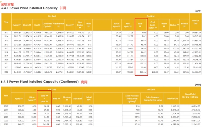 2023年,印尼可再生能源(EBT)比例約為13%。較上年有所增加,但尚未達到2023年至17.9%的目標(biāo),遠低于政府設(shè)立的2025年目標(biāo)。截止2023年底,印尼光伏累計安裝量僅達到589.05MW,甚至達不到千兆瓦量級。