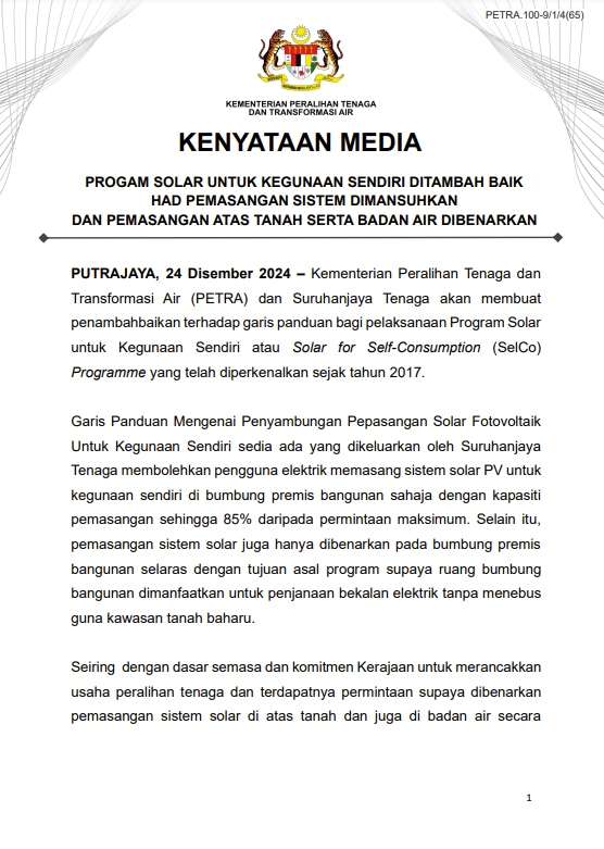 據(jù)馬新社12月23日報(bào)道,能源轉(zhuǎn)型和水資源轉(zhuǎn)型部(PETRA)在一份聲明中宣布,在人民太陽能激勵計(jì)劃(SolaRIS)下,安裝太陽能系統(tǒng)的最高4,000令吉(折合約6500元人民幣)的回扣將延長至2025年4月30日。此延期須遵守SolaRIS資格標(biāo)準(zhǔn)中規(guī)定的條款和條件。